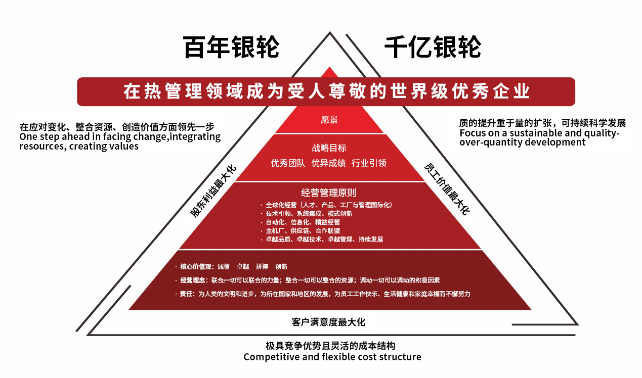 2019—2038年是公司的第二次創(chuàng)業(yè)階段。在這個階段中,銀輪將不斷拓展全球化視野,提升國際化能力,深化體制改革,加強技術(shù)開發(fā),調(diào)整產(chǎn)品結(jié)構(gòu),創(chuàng)新商業(yè)模式,以革命自己的勇氣和決心推進銀輪持續(xù)向世界級優(yōu)秀企業(yè)邁進。